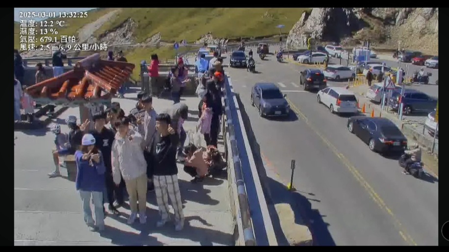 之後我們就開車離開合歡山管理站,路過武嶺的時候又停下來拍照,順便出現在武嶺監視器裡。接著下山往清境農場的方向走,一路上車都很多,到了清境農場附近根本就沒有停車位可以停,下去又上來一趟,連個路邊的私人 200 元停車位也全滿,到底為什麼這麼多人會跑來清境農場啊?到了清境農場的公有停車場前面,結果剛好有一臺車要走,我們就這麼剛好的有位置停了,甚至還是免費的。