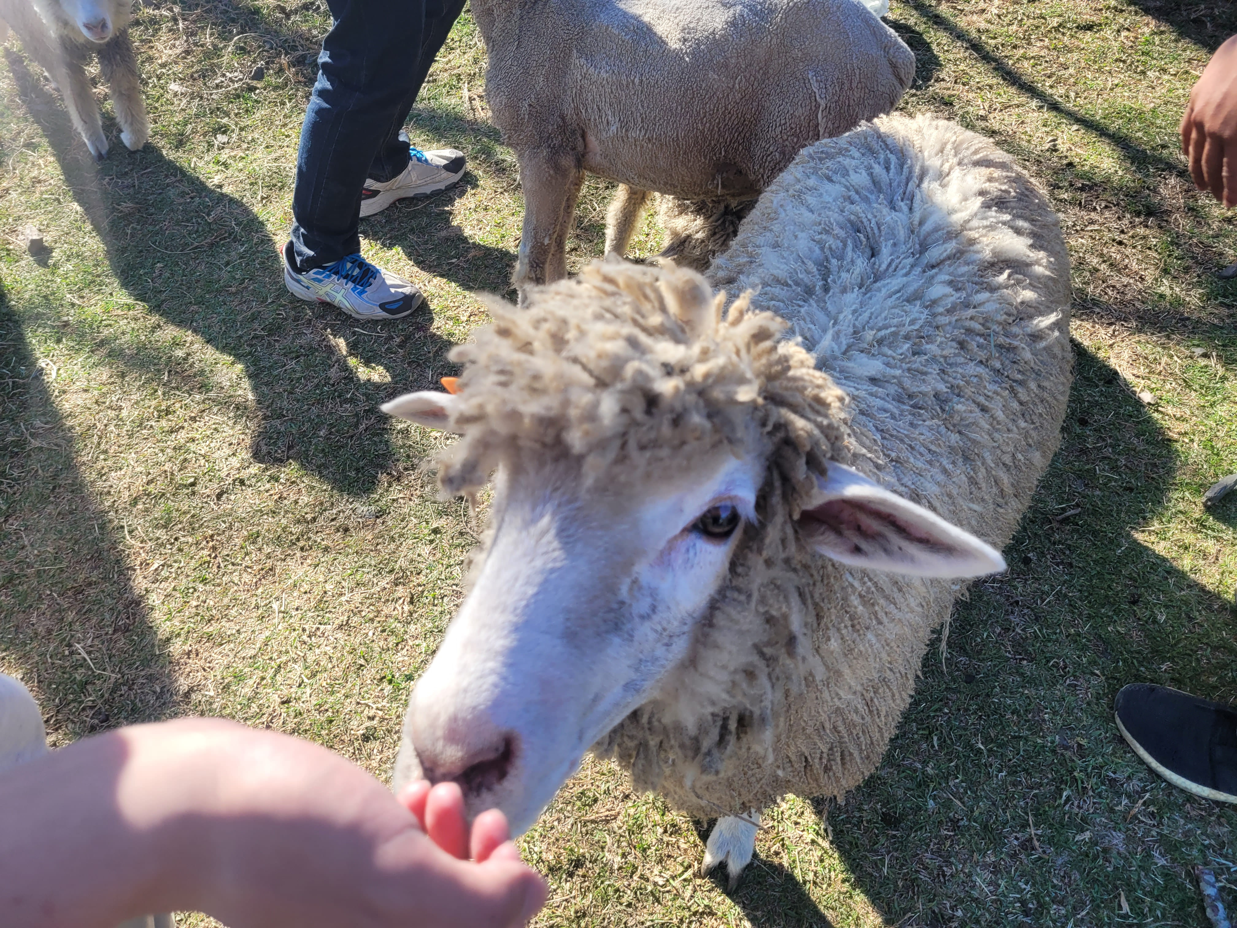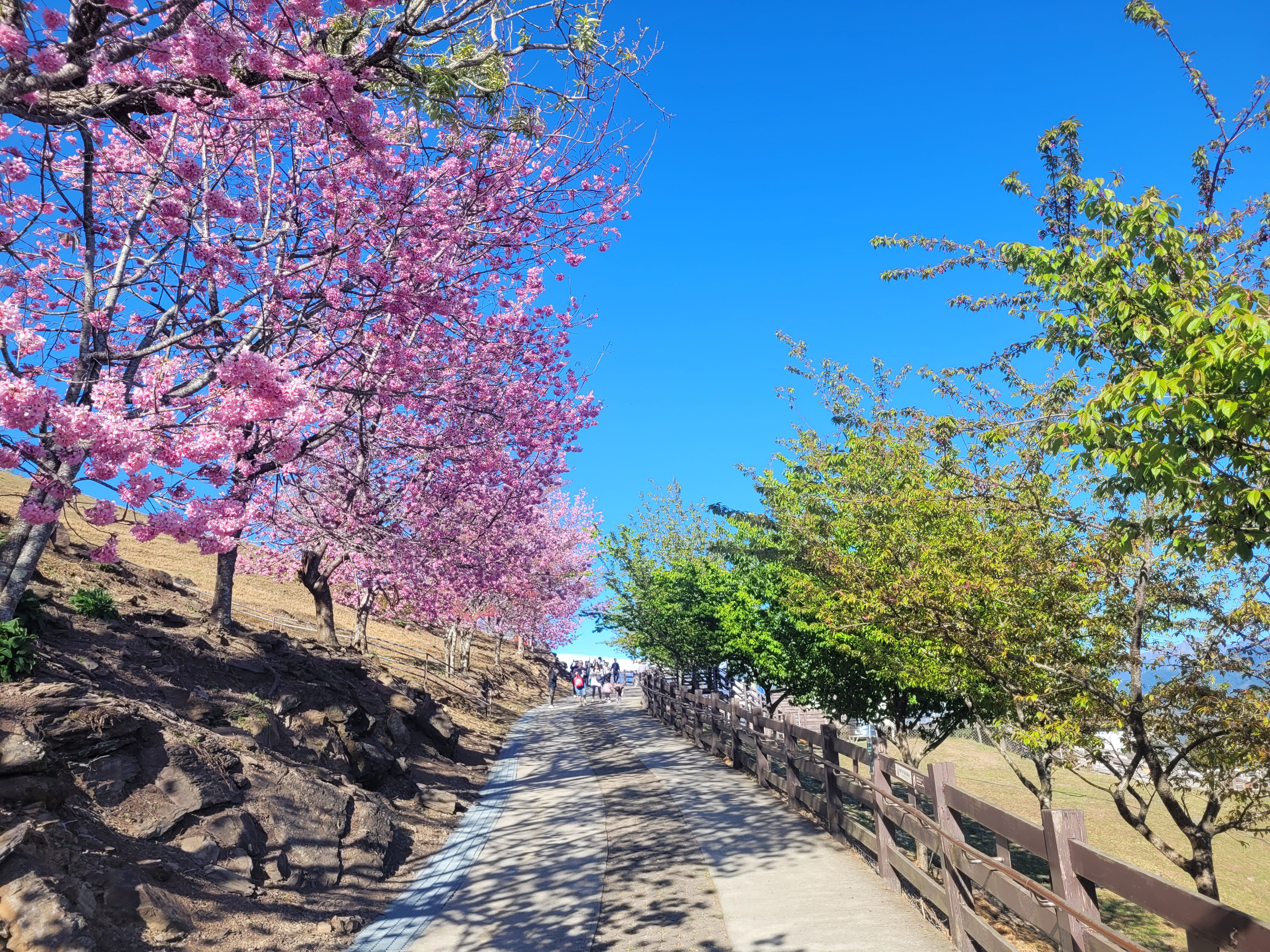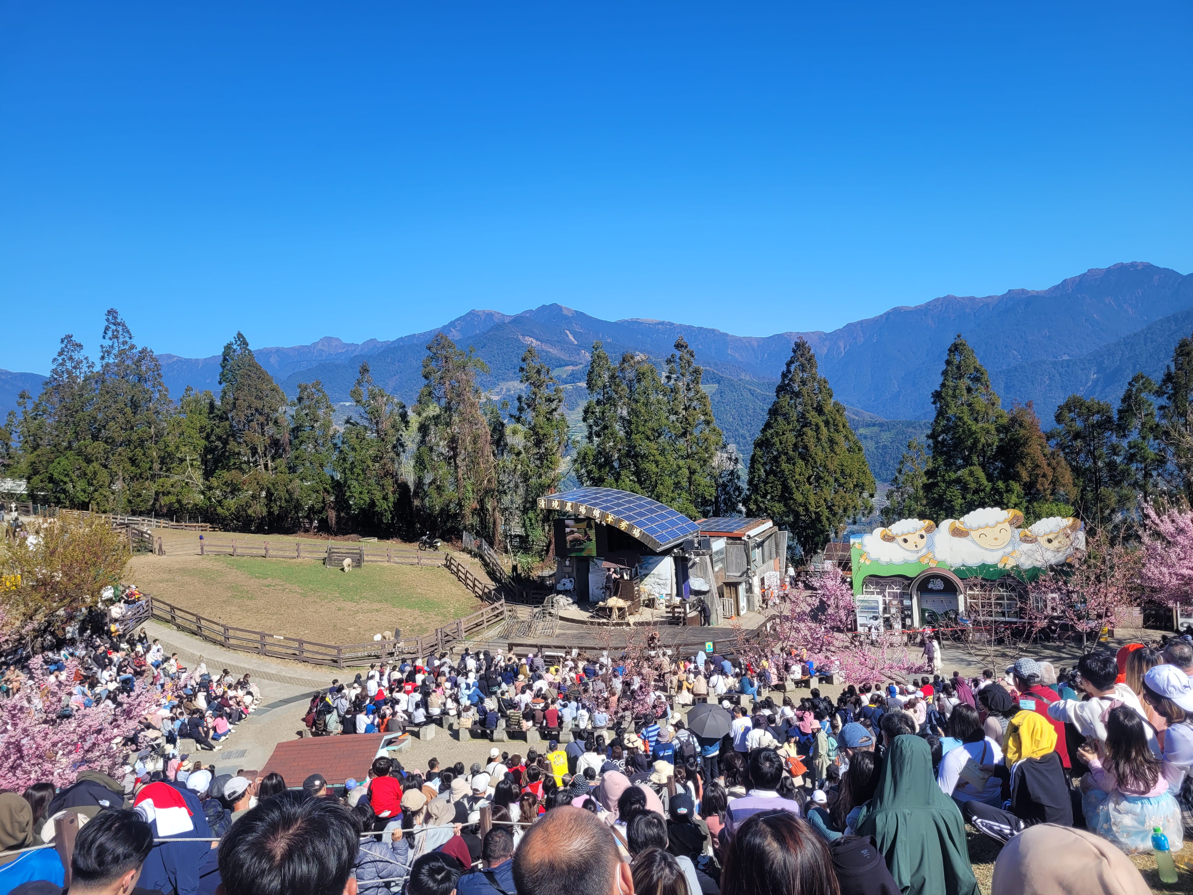 綿羊秀結束之後,我們去了綿羊密度更高的區域,清境農場其實還滿多地方都能近距離接觸綿羊的,還可以買飼料餵牠們吃。只是怎麼會有人會去打綿羊屁股,還在綿羊面前跳帕拉梅拉。清境農場裡的櫻花也滿漂亮的,我們在櫻花樹旁邊拍照拍了 20 多分鐘,在農場裡繞來繞去,也看到樹和天空組成的三原色,這裡真的是一個很適合放鬆的地方。