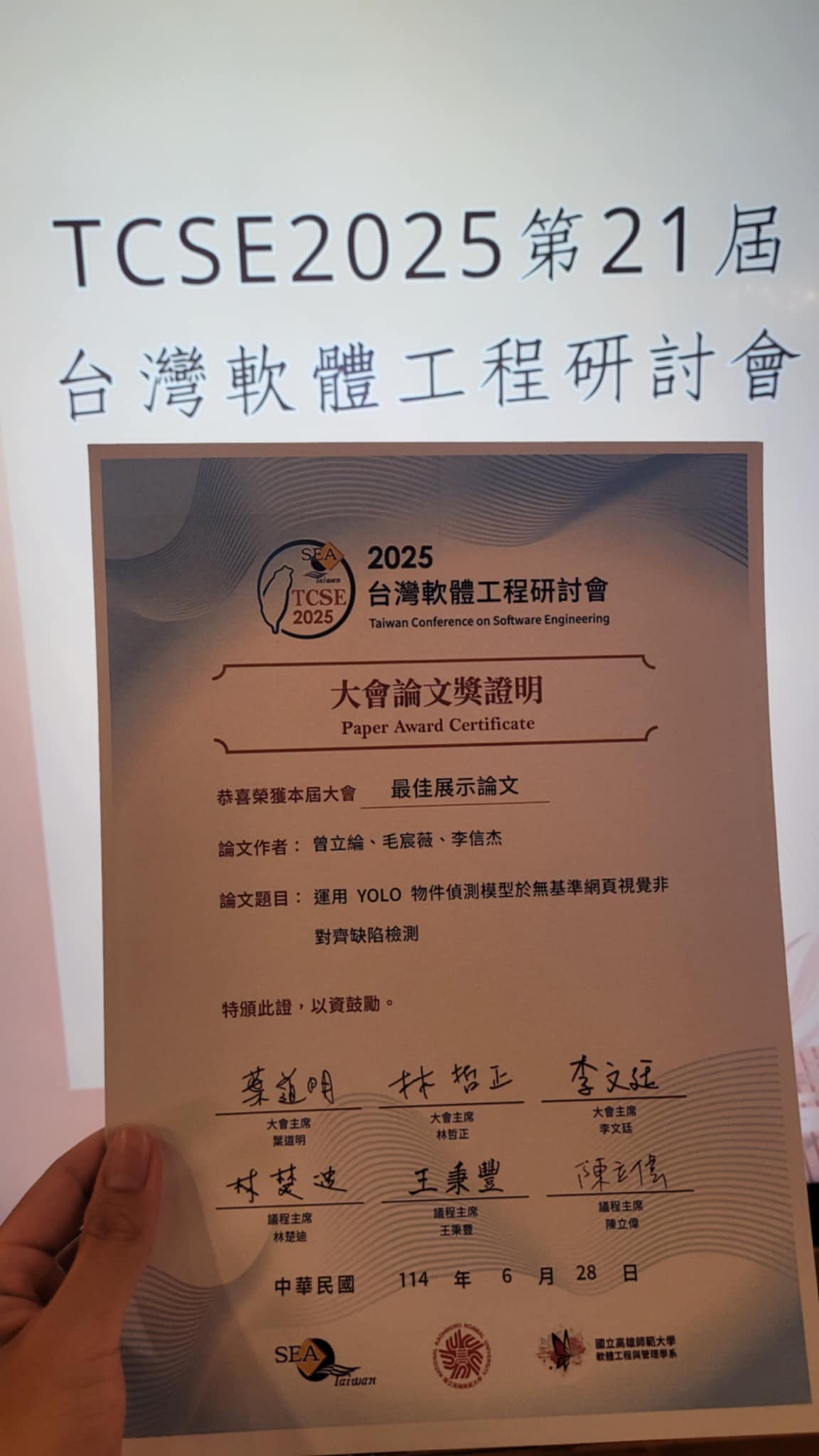 我們結束前跟老師再到外面拍了合照,雖然這次參加的研討會不是什麼頂級研討會,但這次經驗讓我真的滿開心的,一來是學期末之後壓力基本上都釋放了,這次就是用一個來玩的心態來參加,還又拿了一個獎,再來就是這也代表一年的專題正式結束了,說實話專題這東西在學期間還是給我滿大壓力的,雖然說到底還是我不夠強。